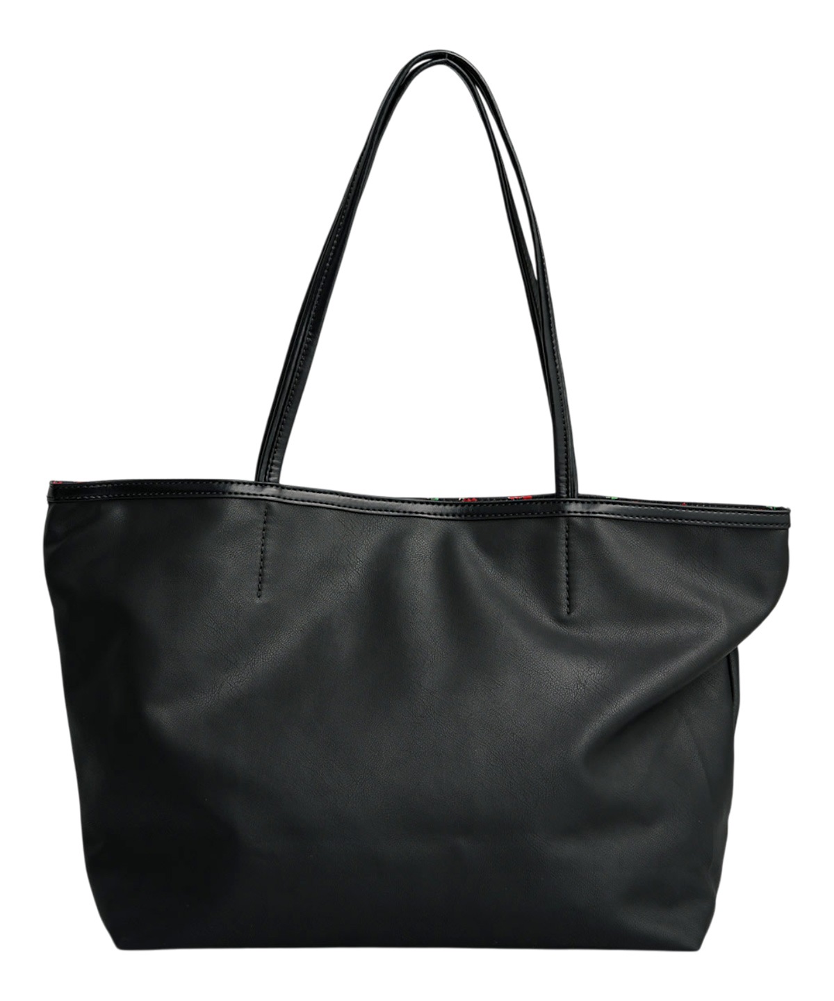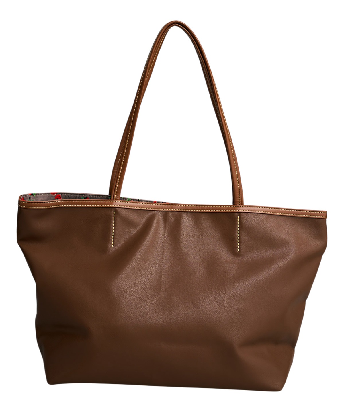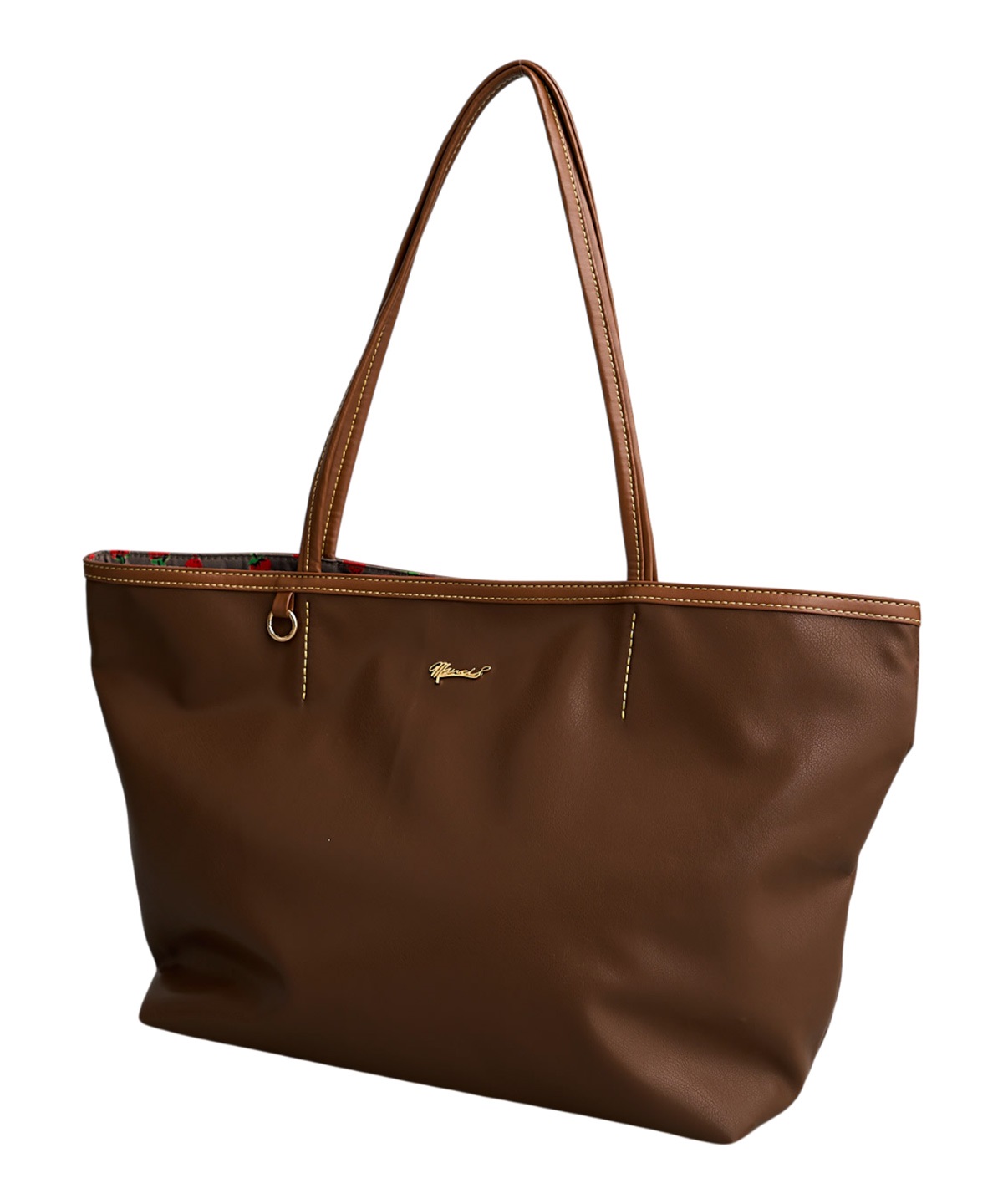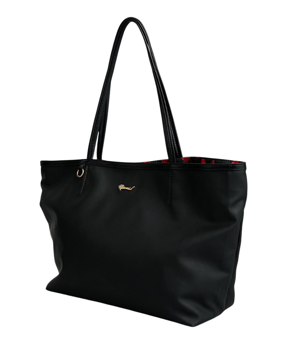 A4サイズの書類やパソコンもすっきりと収納できるサイズ感と小物の整理にぴったりのポケットやキーチャームが付けられる金属リングなど、使いやすさにこだわりました。無地カラーの裏地にはオリジナルイチゴプリントの裏地で遊び心を添えています。