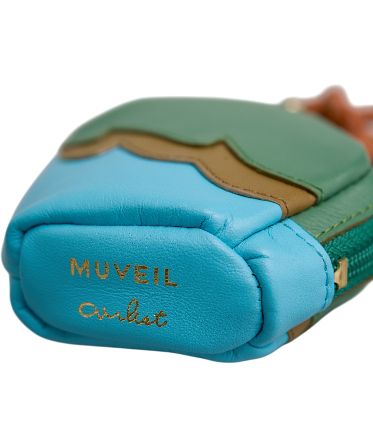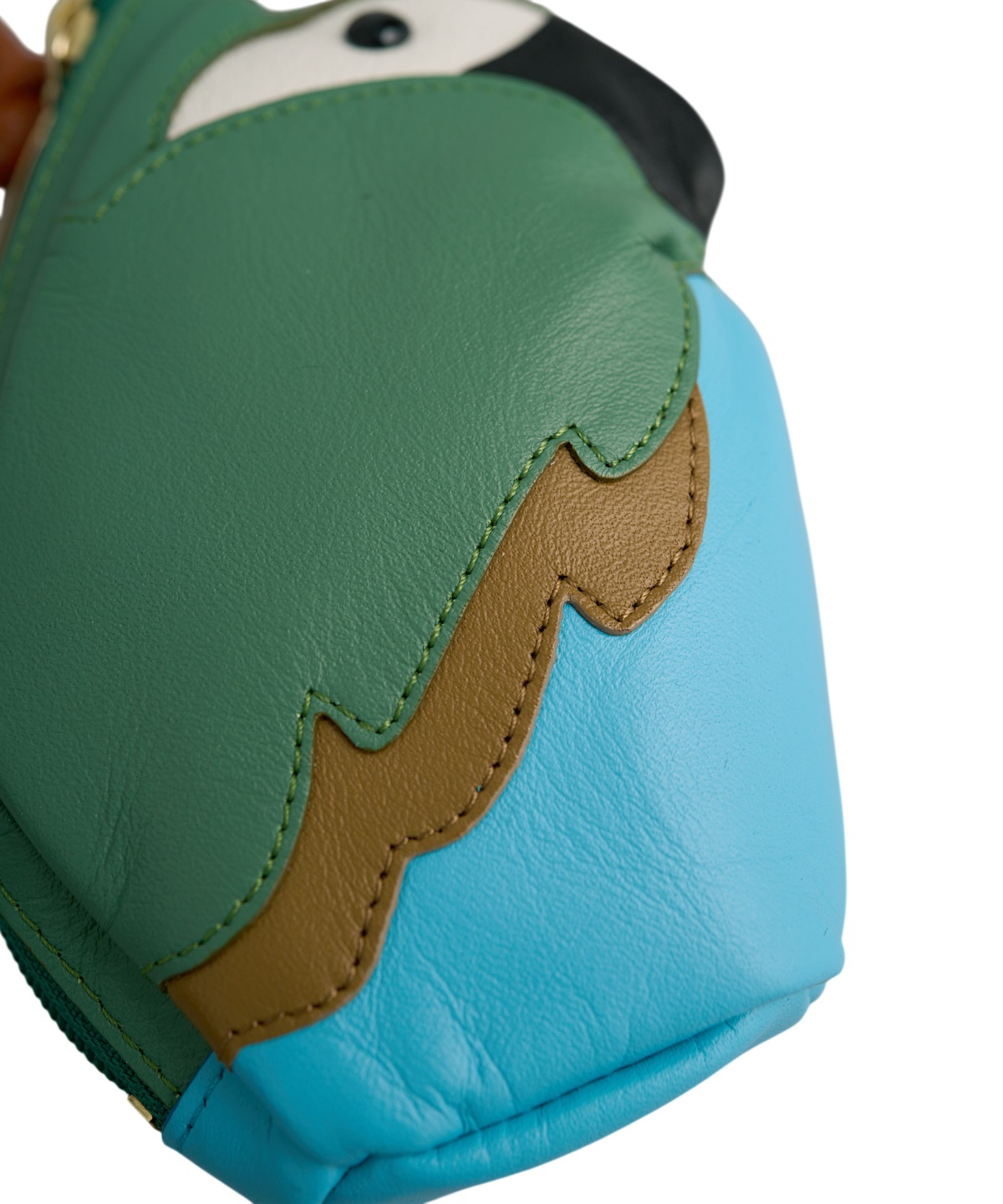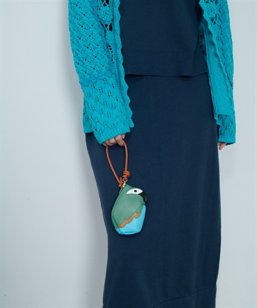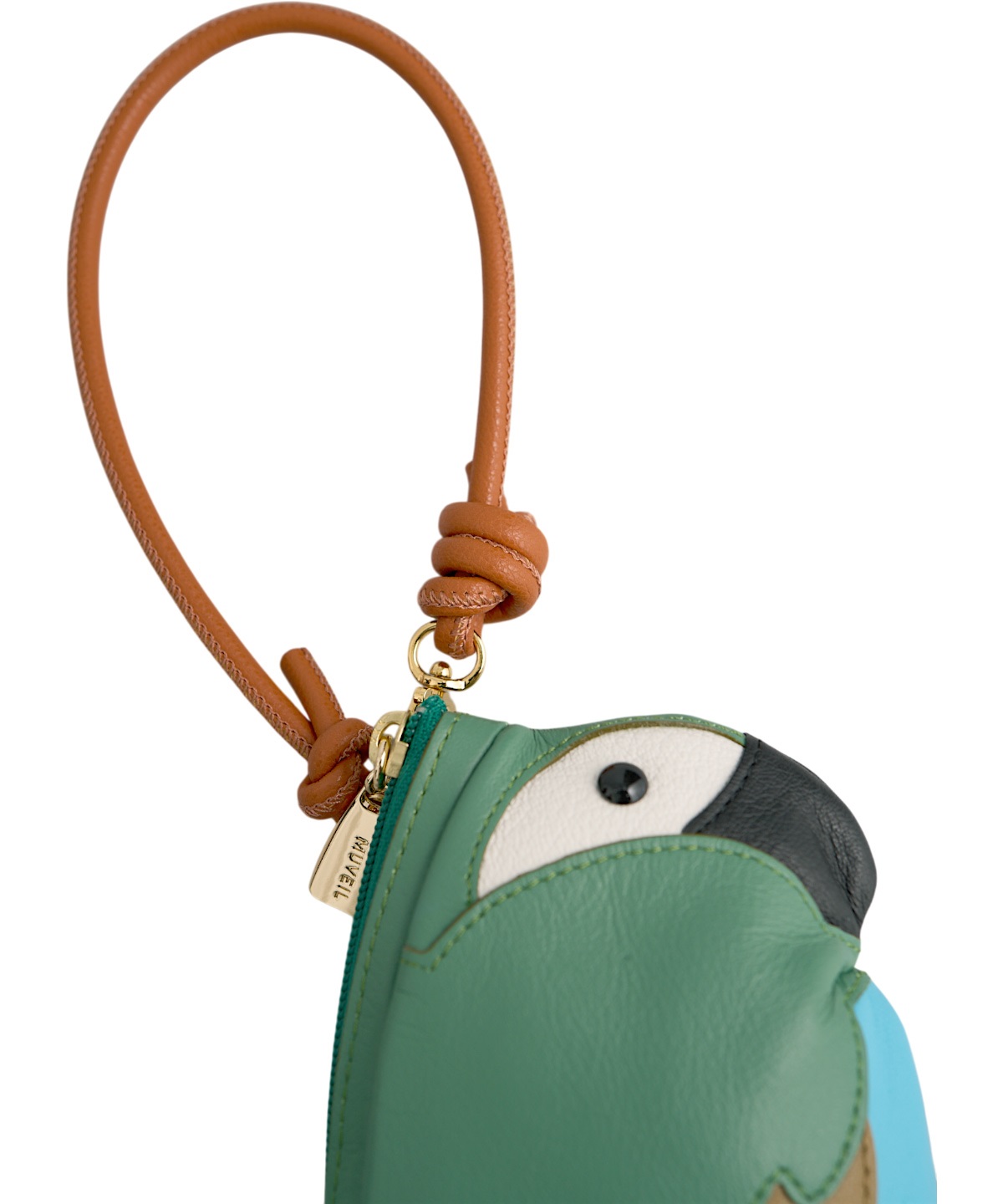 - バッグチャームとしておすすめのオウムレザーポーチ。ユーモアたっぷりのモチーフを大人っぽいカラーリングでエレガントに仕上げました。イヤホンやリップなどの小物をきちんと収納しながら、スタイリングのポイントにお使いいただけます。
