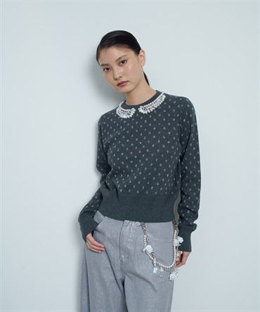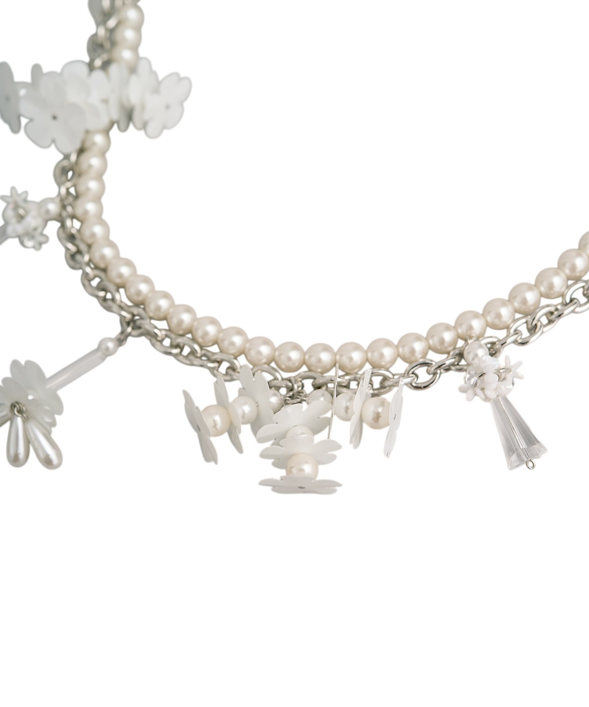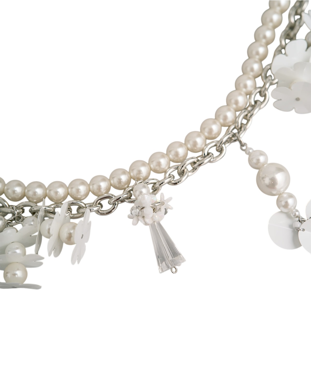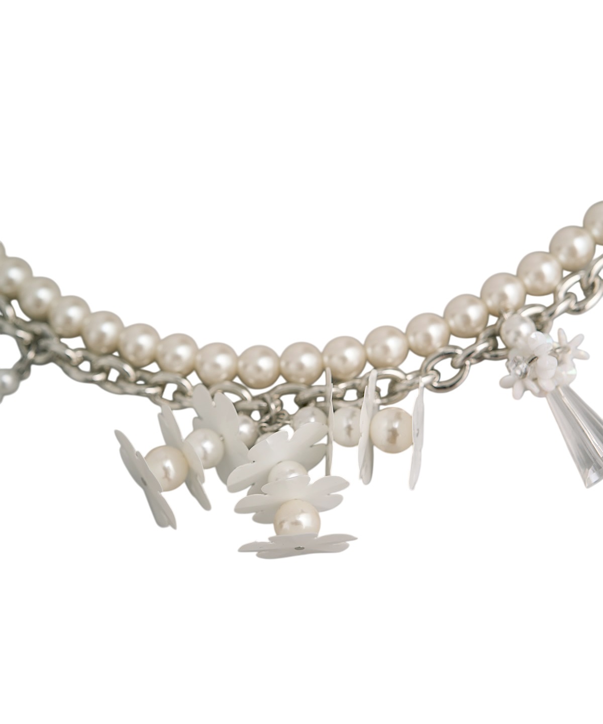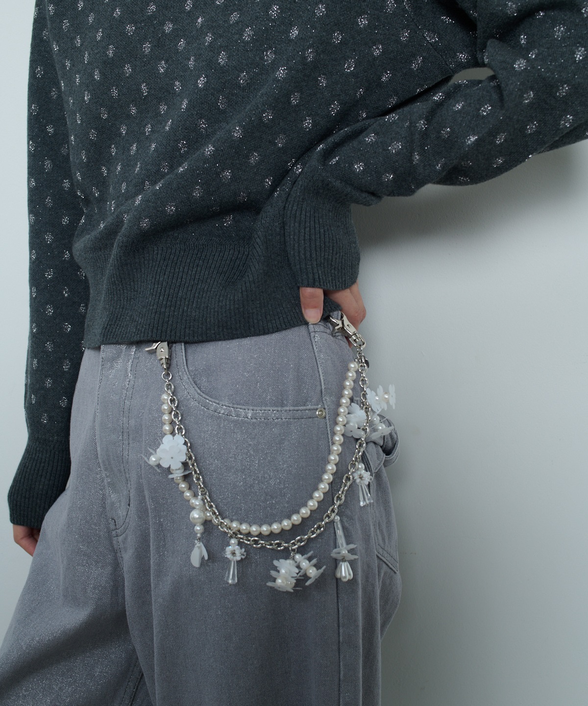 バッグチェーンやウォレットチェーンとして使用できるビジューチェーン。フラワー型スパンコール、フェイクパール、アクリルパーツなどで作成したチャームを、バランスよくチェーンに配置しています。カジュアルボトムのベルトループやバッグのストラップに引っかけてスタイリングのポイントに。