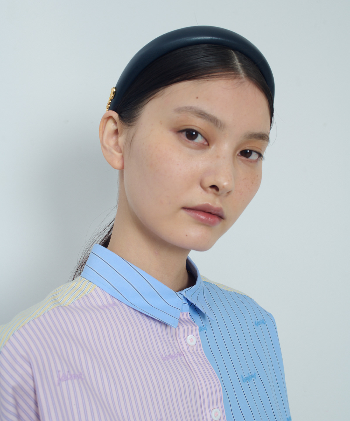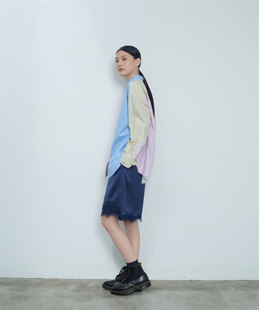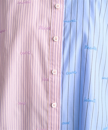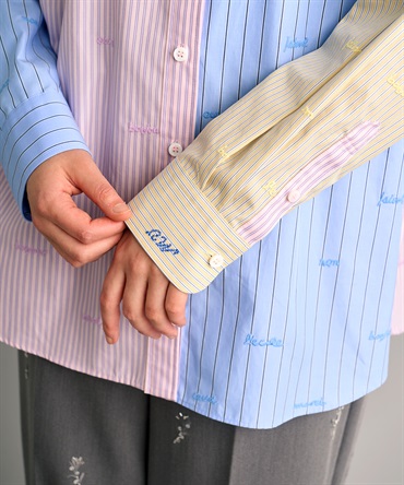 異なるストライプ生地をミックスしたシャツは存在感がありながらも優しいカラーで合わせやすいのがポイント。