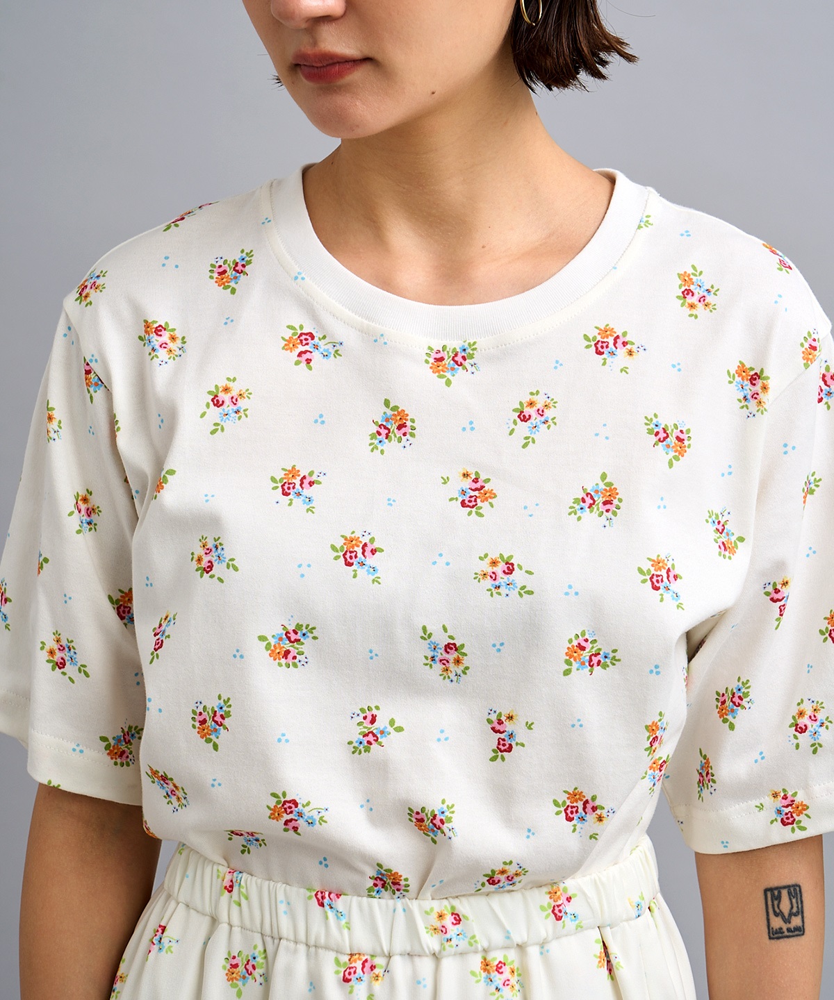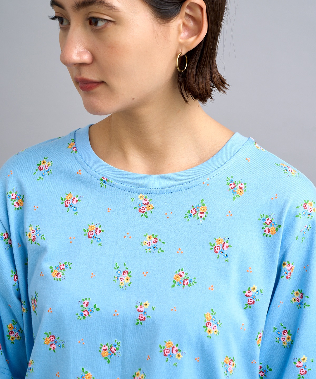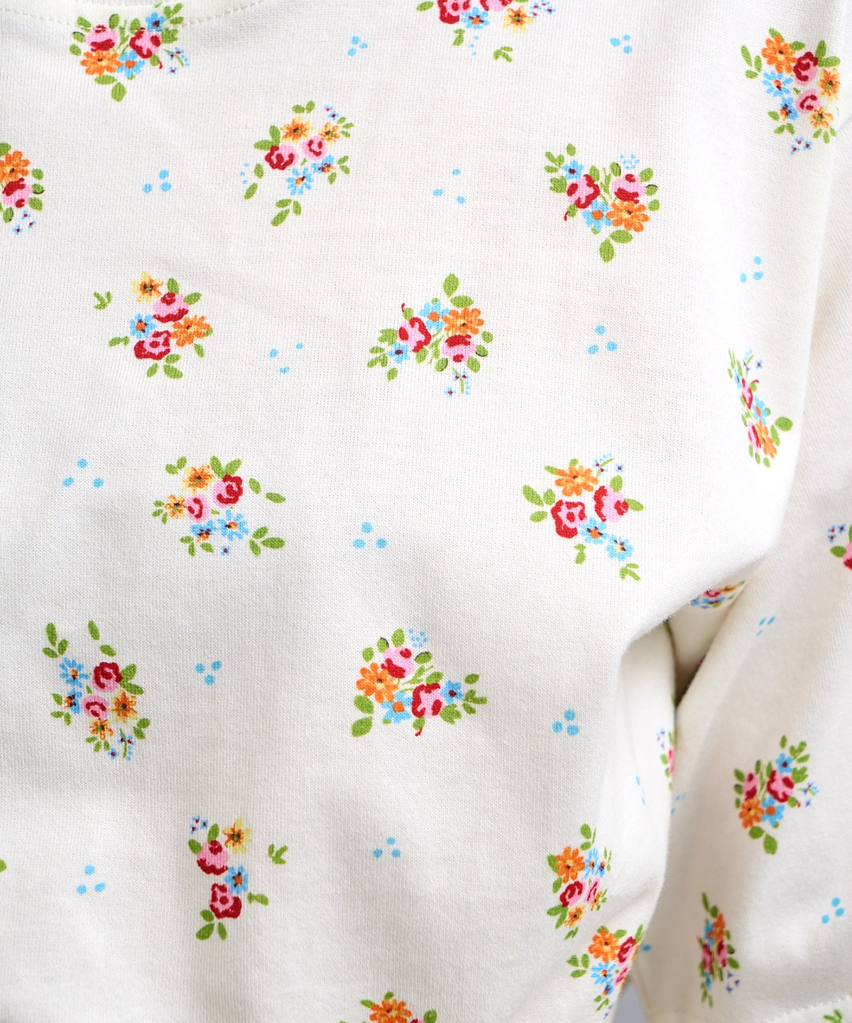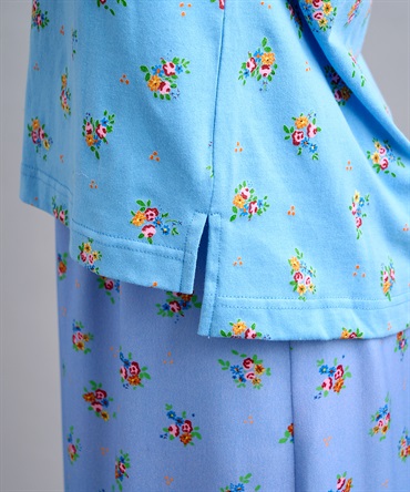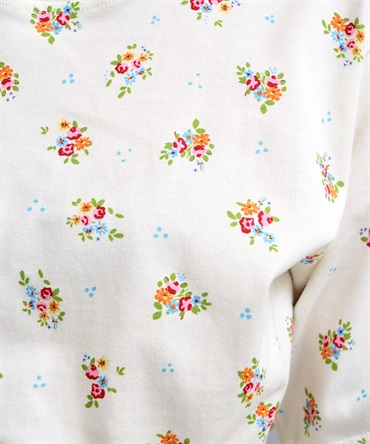 アンティークのティーカップに描かれた絵柄をモチーフに王室の優雅さを纏う特別なプリント生地。ゆったりとしたシルエットで体のラインをひろいません。