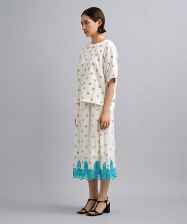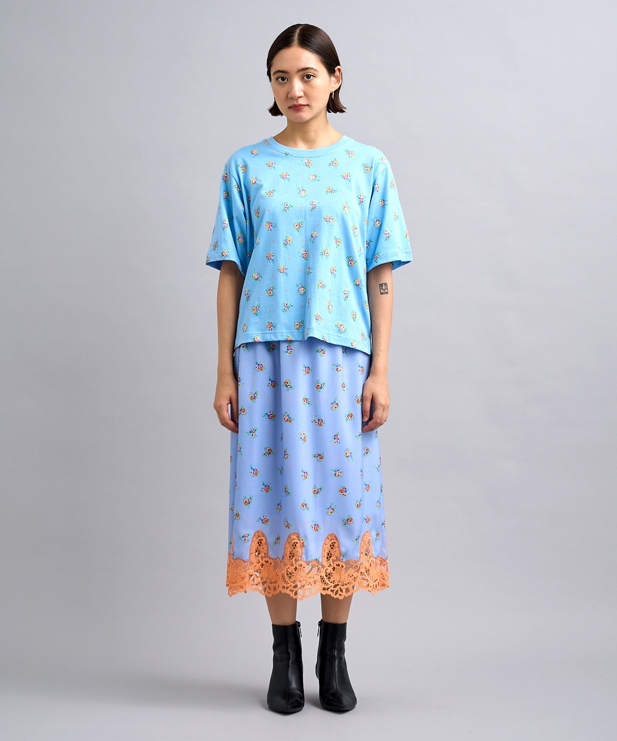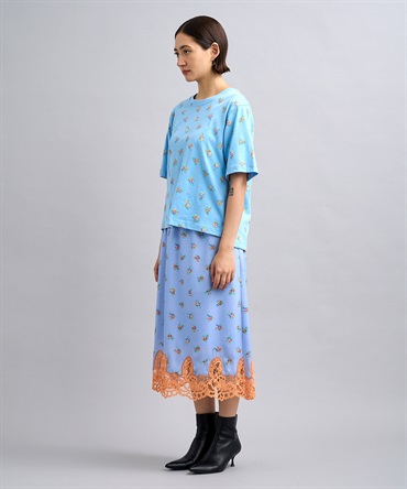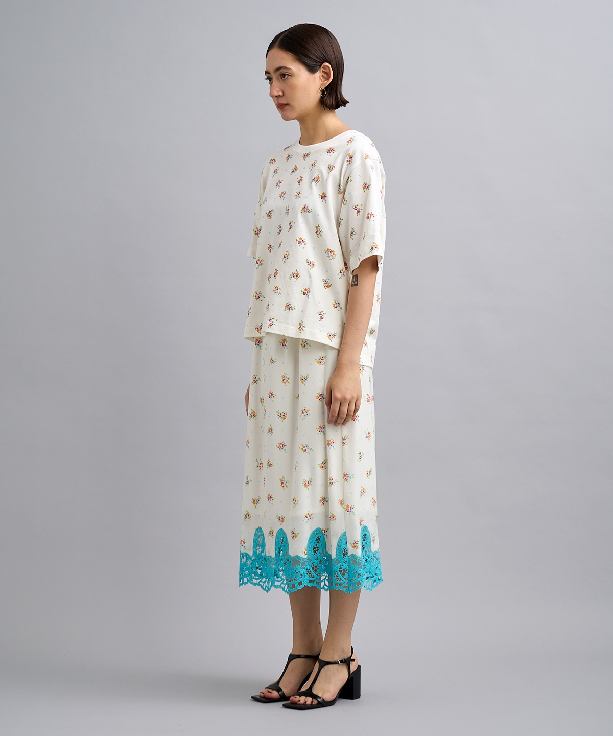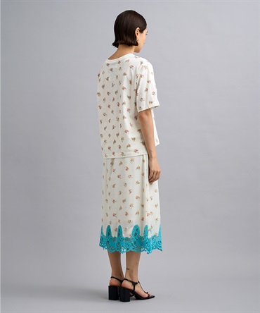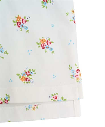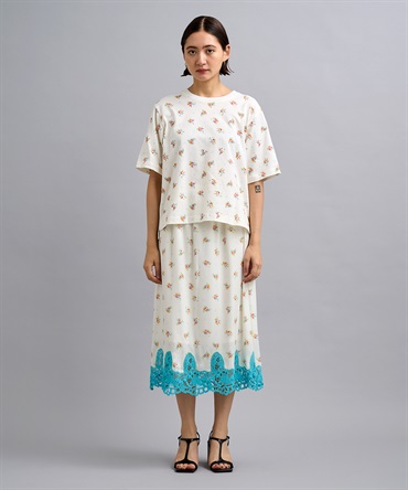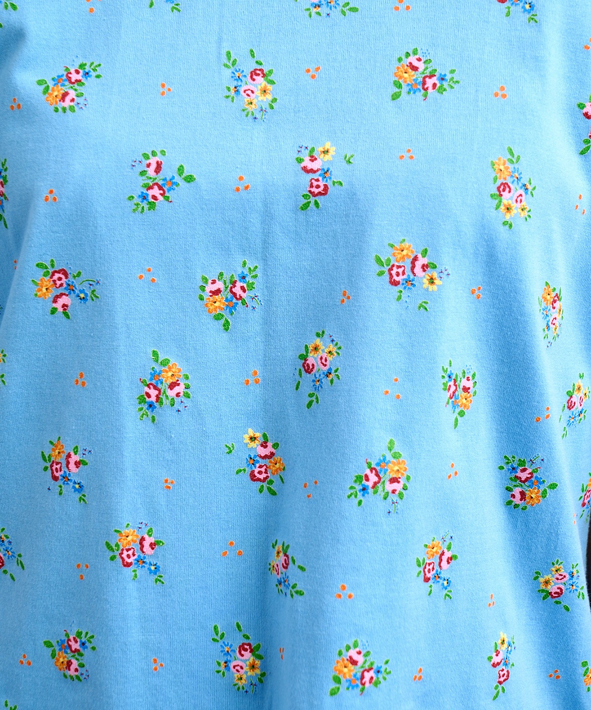 アンティークのティーカップに描かれた絵柄をモチーフに王室の優雅さを纏う特別なプリント生地。ゆったりとしたシルエットで体のラインをひろいません。