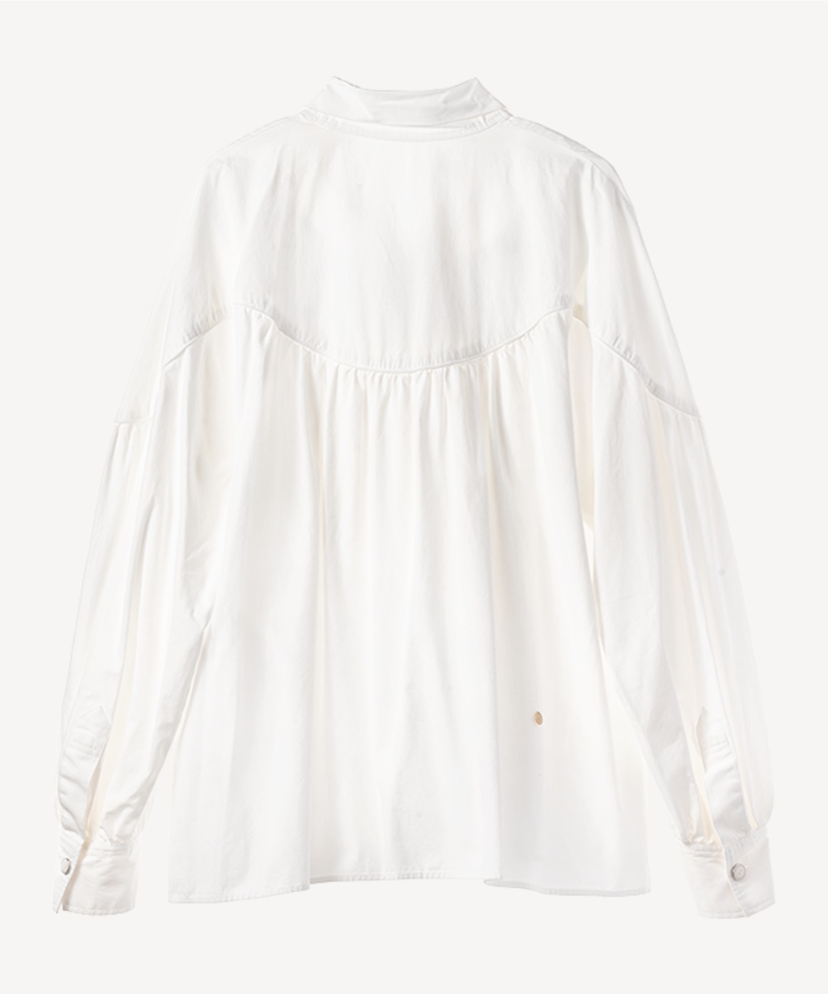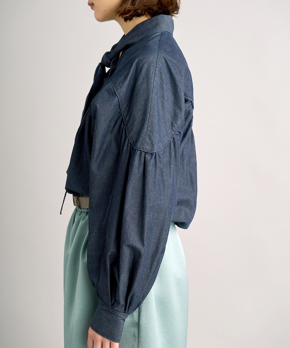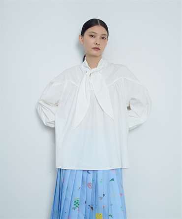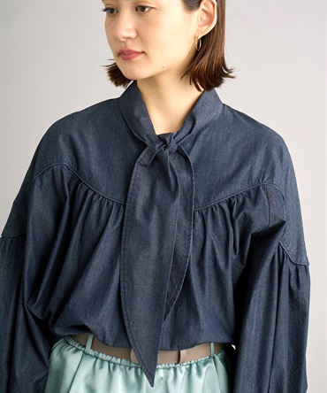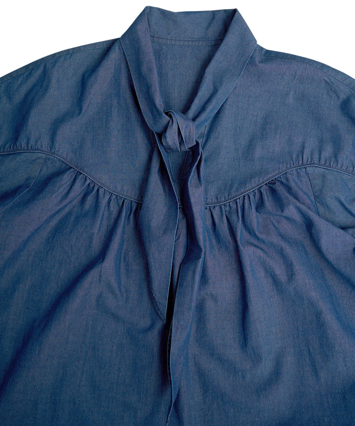 ヴィンテージライクな佇まいのボータイチュニックブラウス。シンプルなデザインながらコードテープで表情を添えました。生地に洗いをかけているためこなれた印象で着こなせます。肩回りはスッキリとしながら、ボリュームのあるバルーンスリーブがポイント。ボータイの結び方でカジュアルにもエレガントにもスタイリングできるチュニックブラウスです。