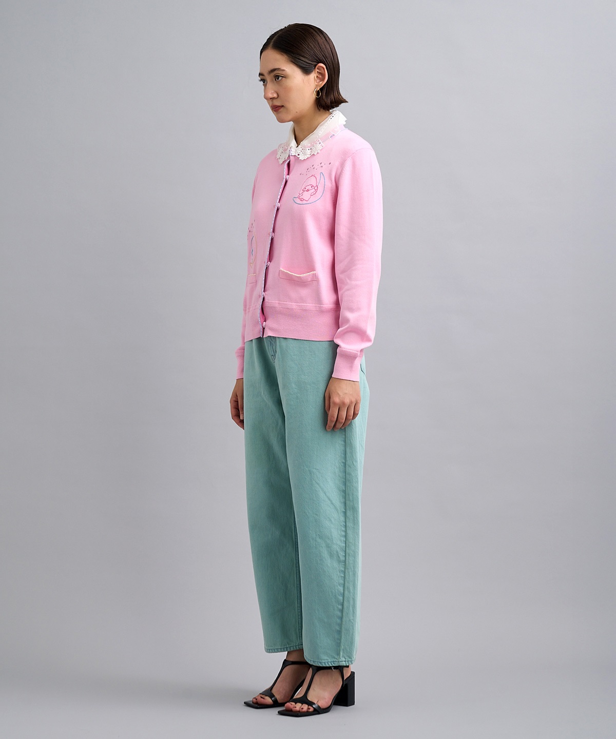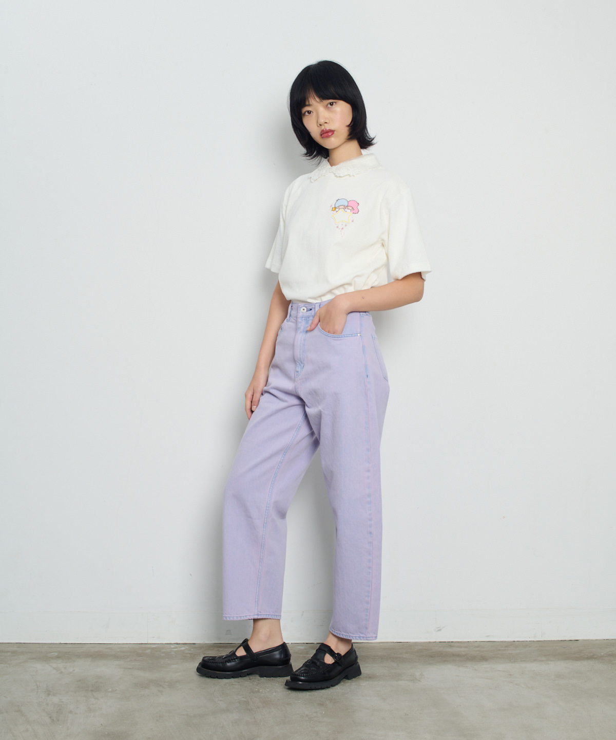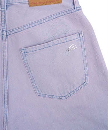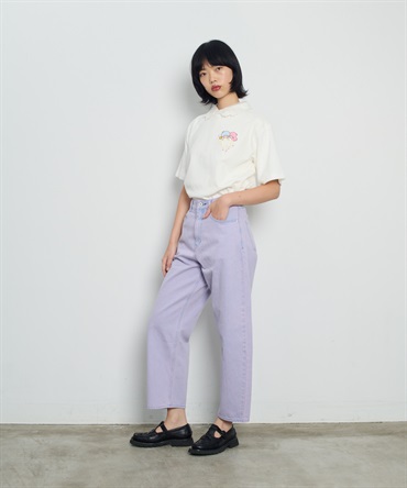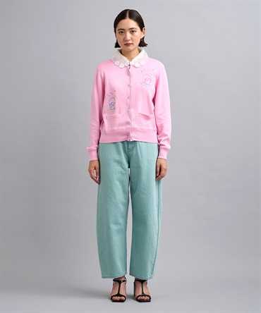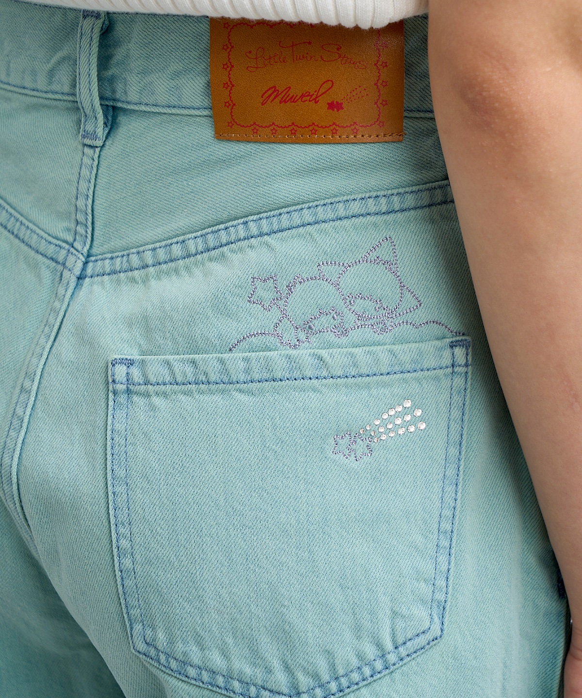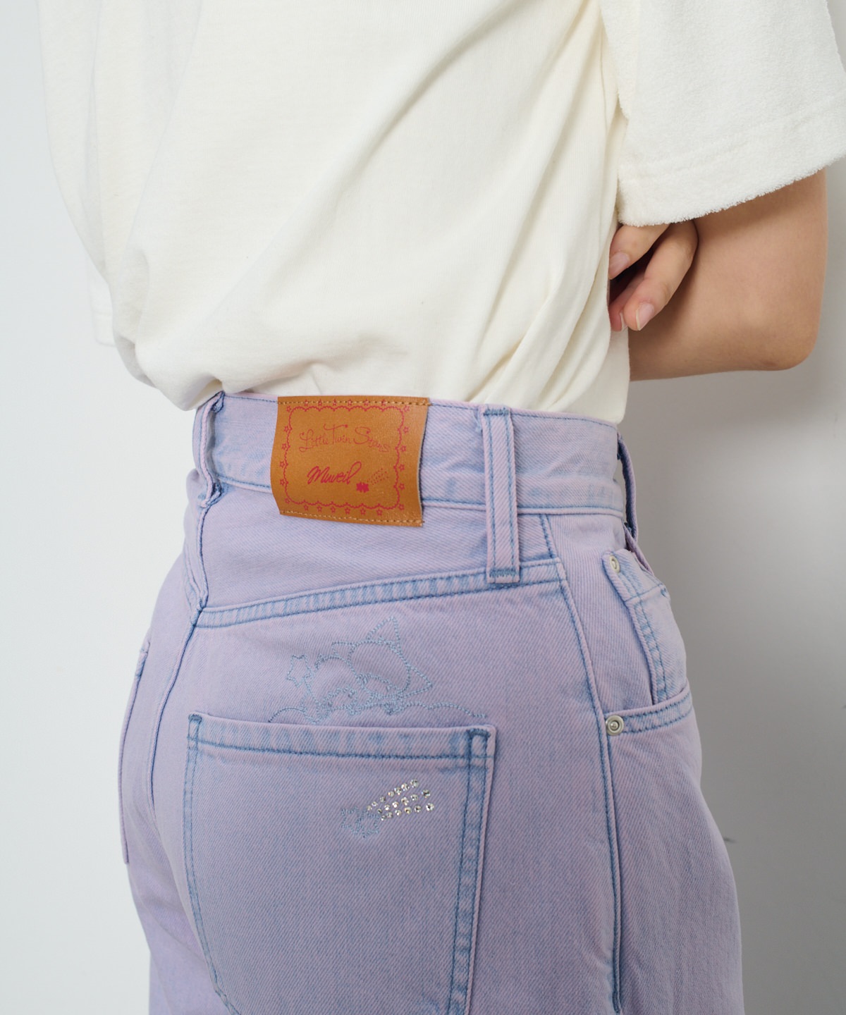 「ポケットから顔を出すリトルツインスターズ」を刺繍したオーバーサイズシルエットのバレルパンツ。アイテムを縫製してから、洗い加工、ステッチ刺繍、スワロフスキーの手付け装飾を施しています。いくつもの工程を経て完成する特別なアイテムをデザインしました。