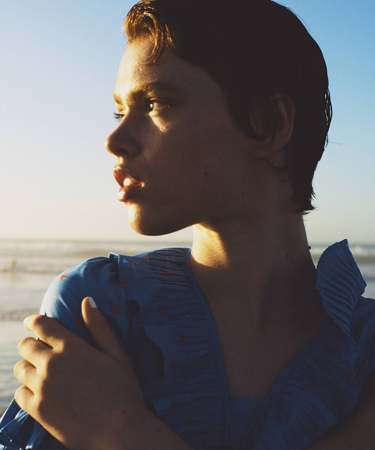 襟元や裾にカッティングやシャーリングで水際を表現。波の動きを取り入れたピコレースや、ヒレをイメージしたボトムディテールなど、涼やかな動きを取り入れました。