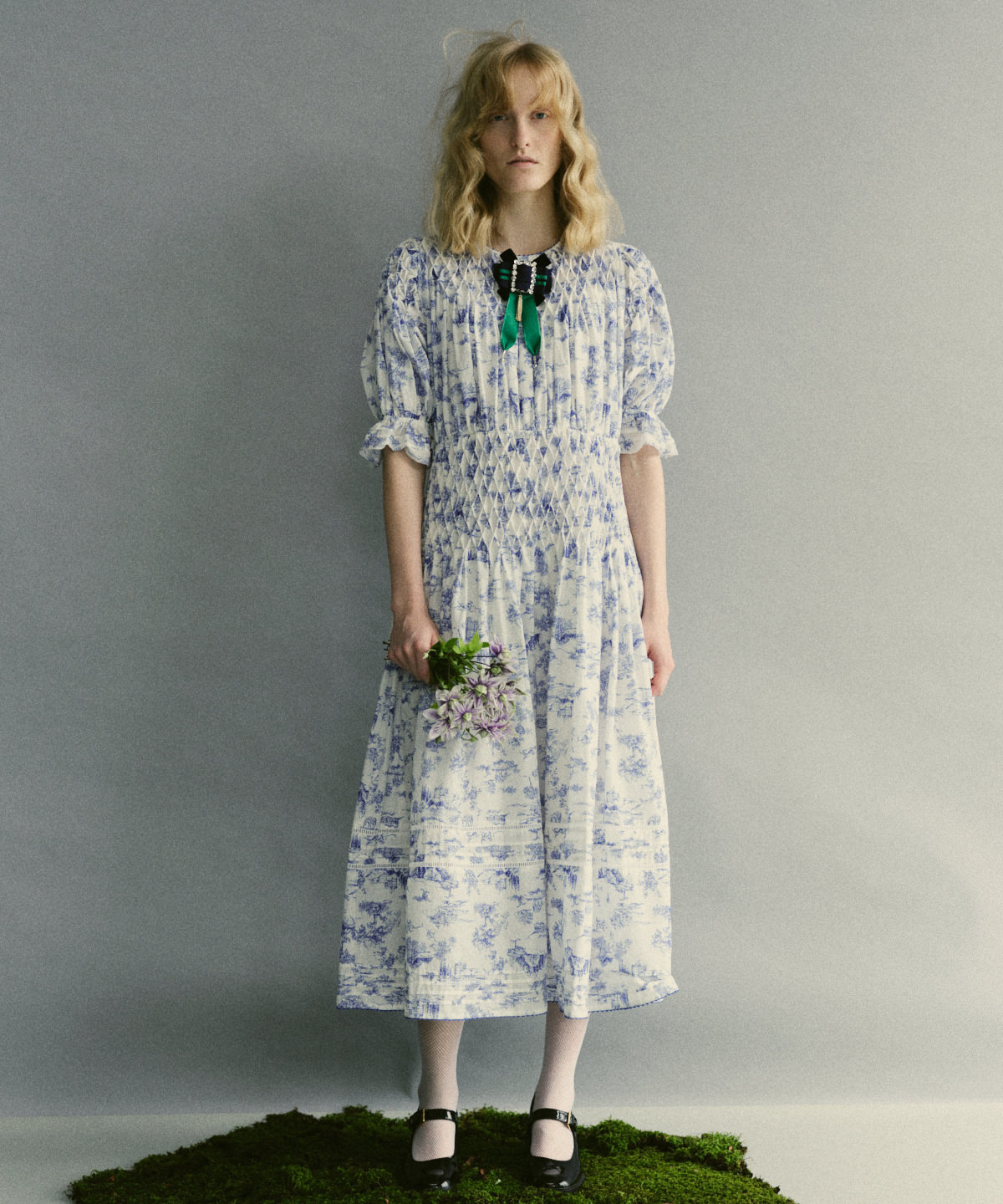 皇妃と同時代に広まったトワル ド ジュイのオリジナルプリントに。乗馬を愛した彼女が逃避行する景色を描き、彩度の高い色でプリントすることで牧歌的な風景を鮮やかに彩りました。当時のコルセットラインは、スモッキングの手仕事でリラックス感のある柔らかなシルエットを生み出しています。