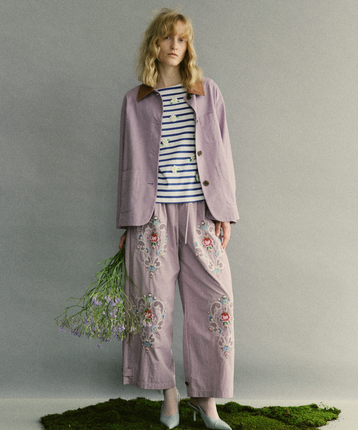 彼女が愛した2つの花を刺繍とプリントで表現。スミレは、1輪ずつ刺繍しながらストライプ柄へと組み上げられたオリジナルファブリックに。刺繍糸のみに色を重ねる技法で水彩画のようなニュアンスを纏わせました。花びらのみフロッキー加工を施したエーデルワイスのオリジナルプリントは、ハンカチのように縁取り、柔らかな動きを与えます。