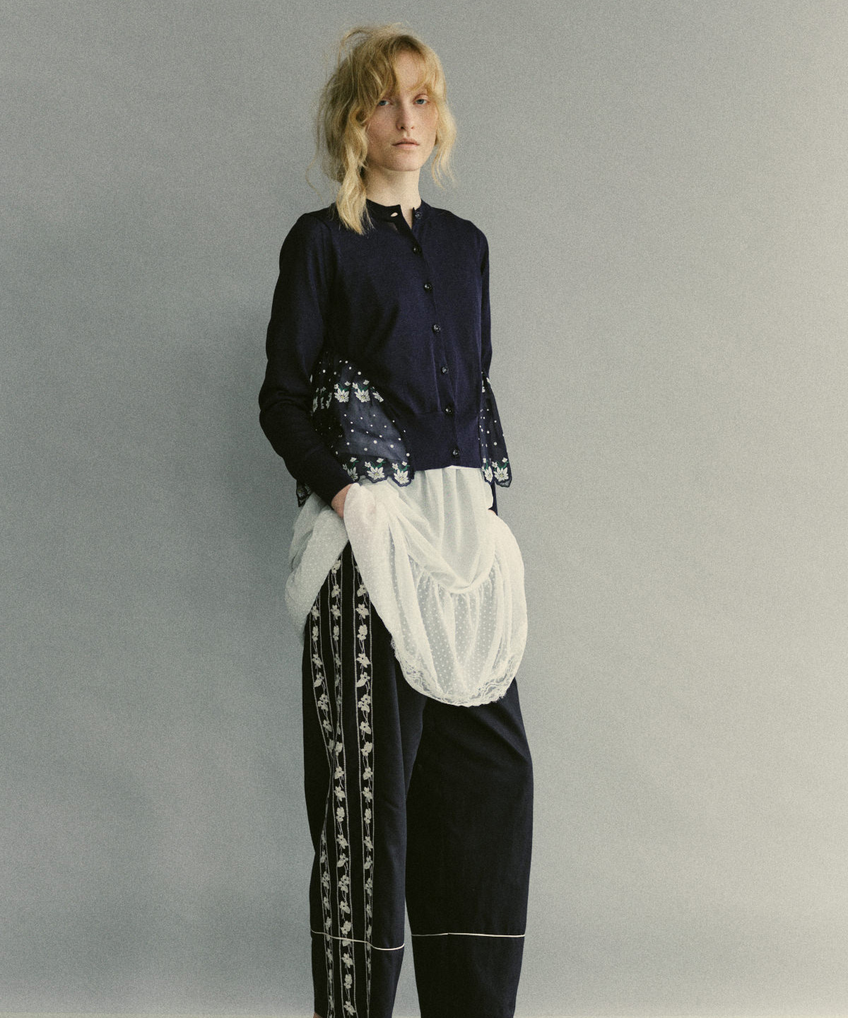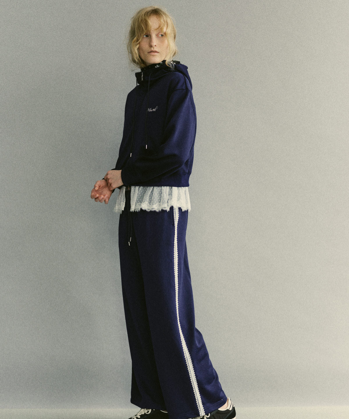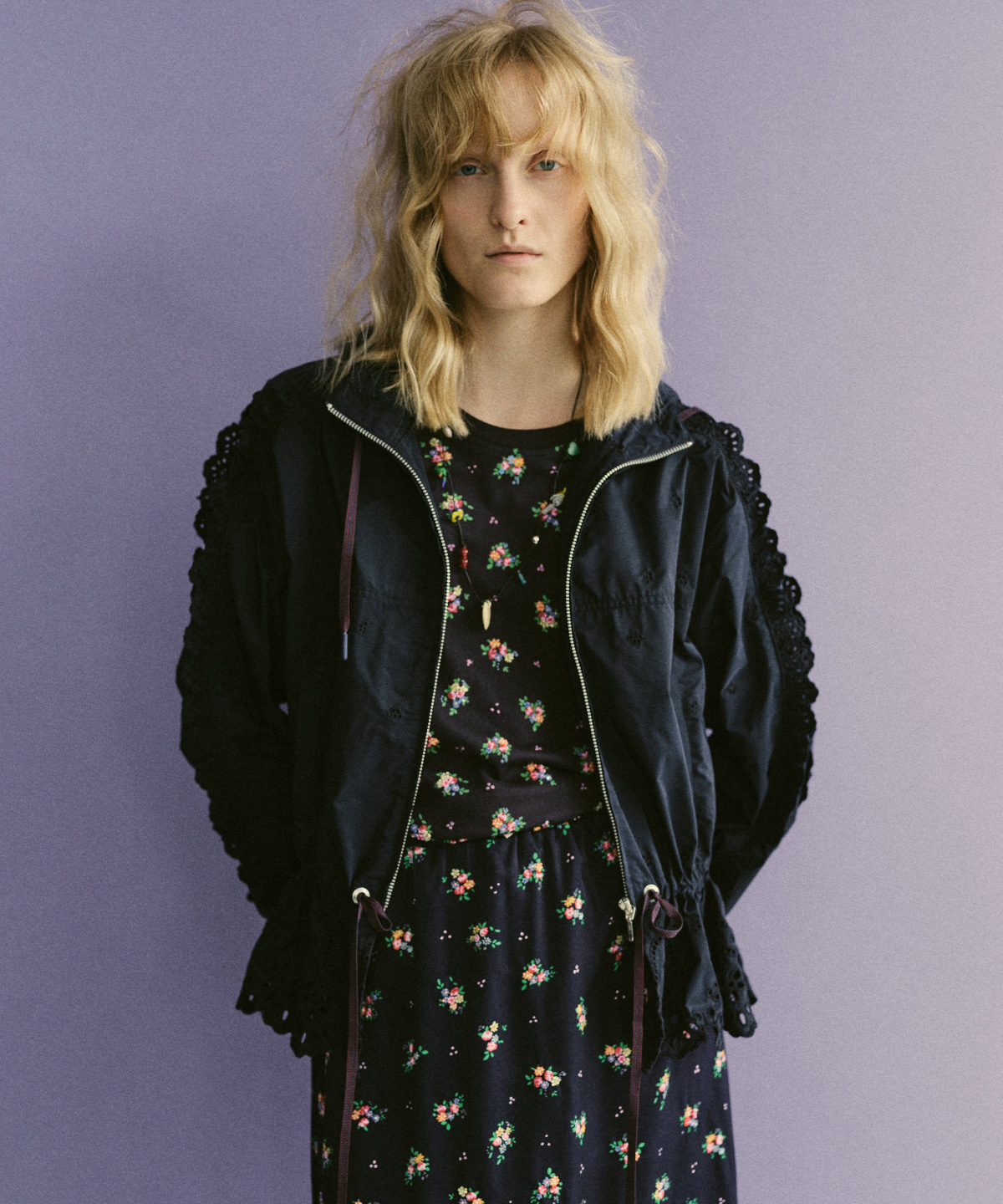 オリジナルレース取り入れて、ロマンティックなムードを日常に添えます。スポーツライクな生地にカットワークレースを施したオリジナルファブリックは裏地にメッシュを使用しよりアクティブな表情を引き出します。ボトムスを中心にレースでラインを浮かび上がらせ、シルエットに動きを加えました。