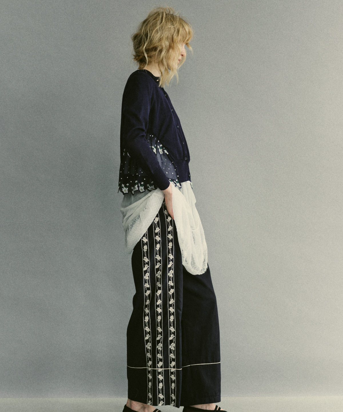 当時の宮廷文化を象徴するプチポワン刺繍をカジュアルなアイテムへ施し、軽やかさを備えた特別な1枚に。ネオンカラーのビーズを手で縫いつけて、立体的に表現しています。ウィーンを代表するアウガルテン磁器に描かれる愛らしい花々を再現したオリジナルプリントは、涼やかなコットン生地に映しこみました。