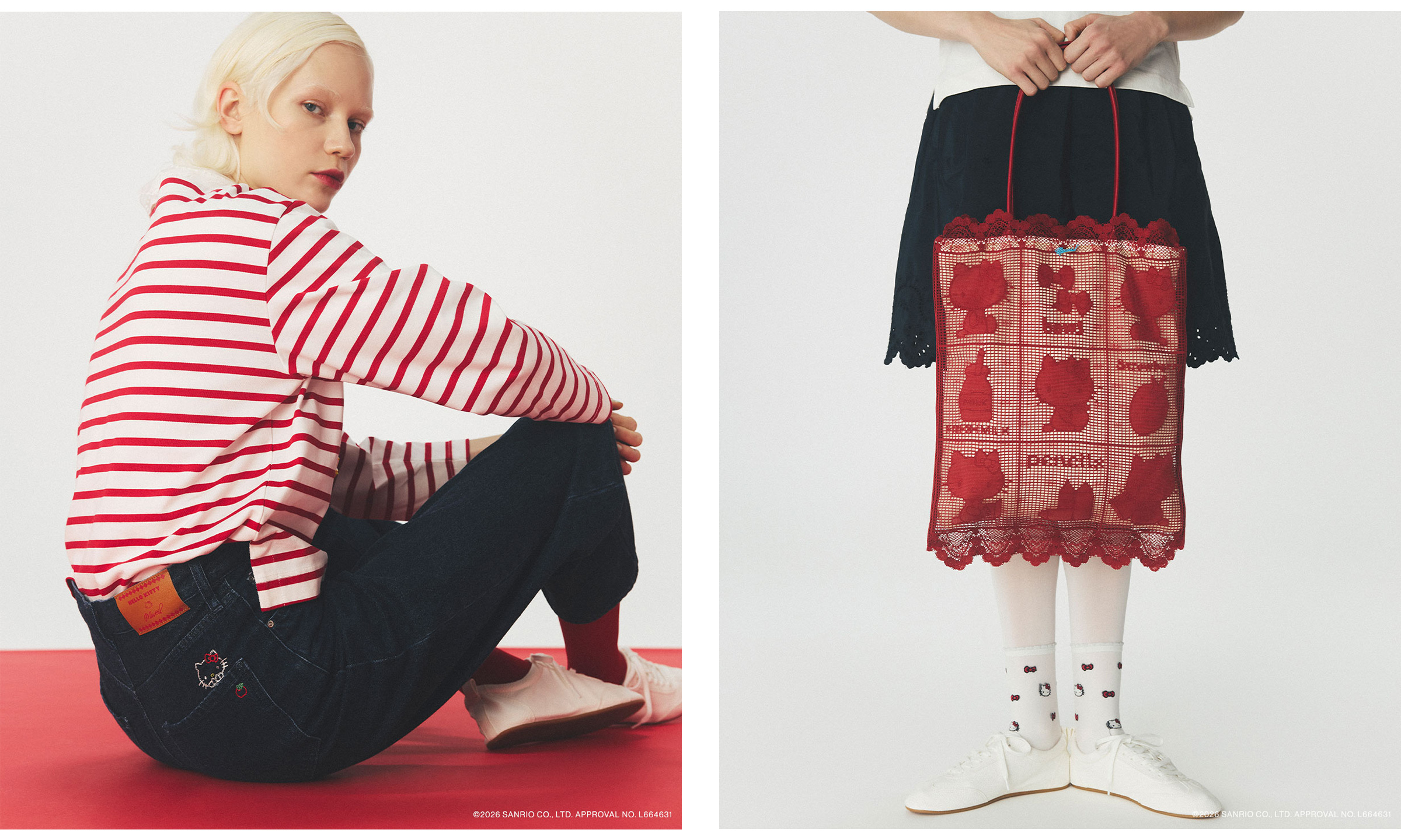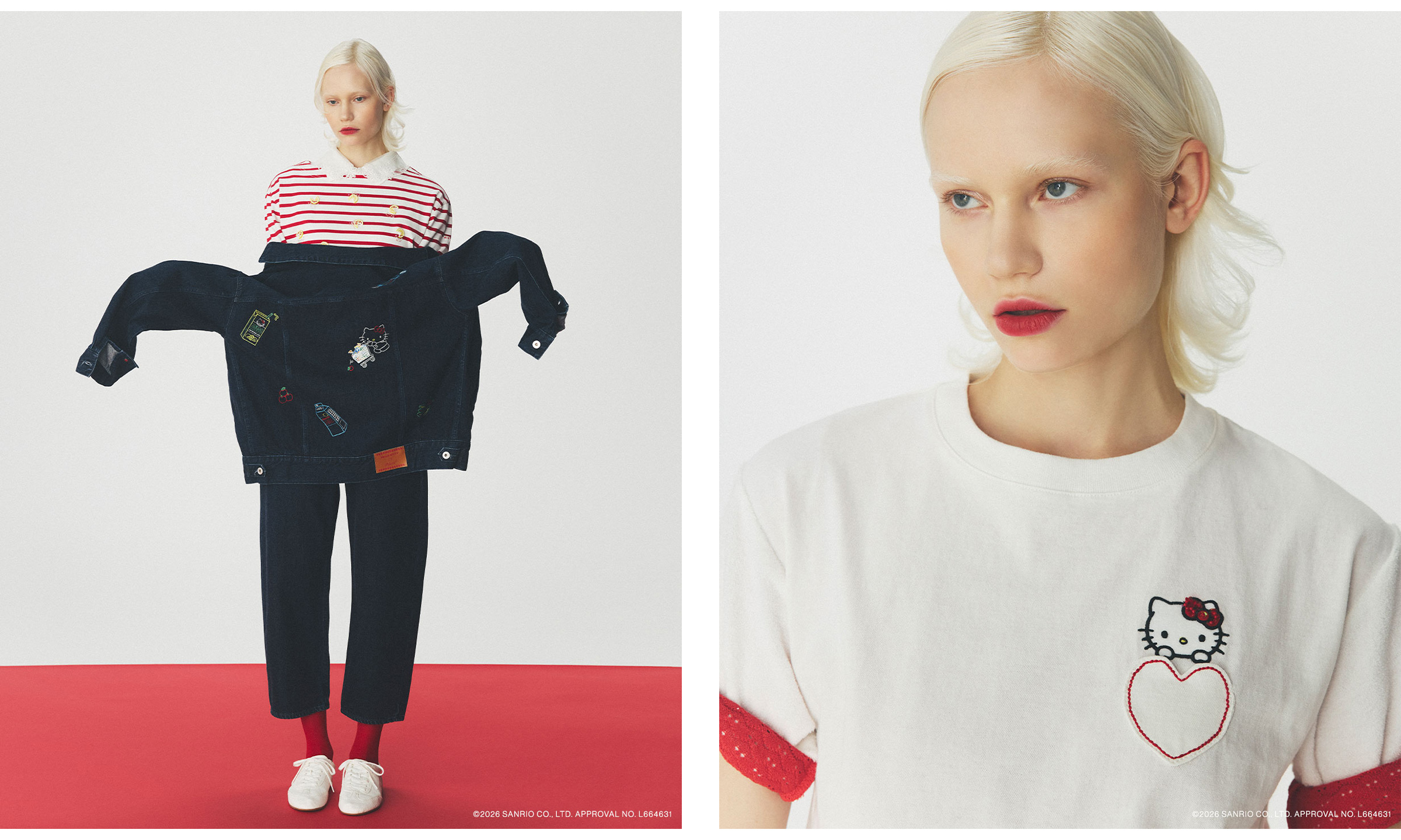 ハローキティとリトルツインスターズを表現したデニムジャケットやデニムパンツ、カーディガン、Tシャツ、レースバッグ、ソックスと、日常のワードローブとして自然に取り入れられるアイテムを展開します。