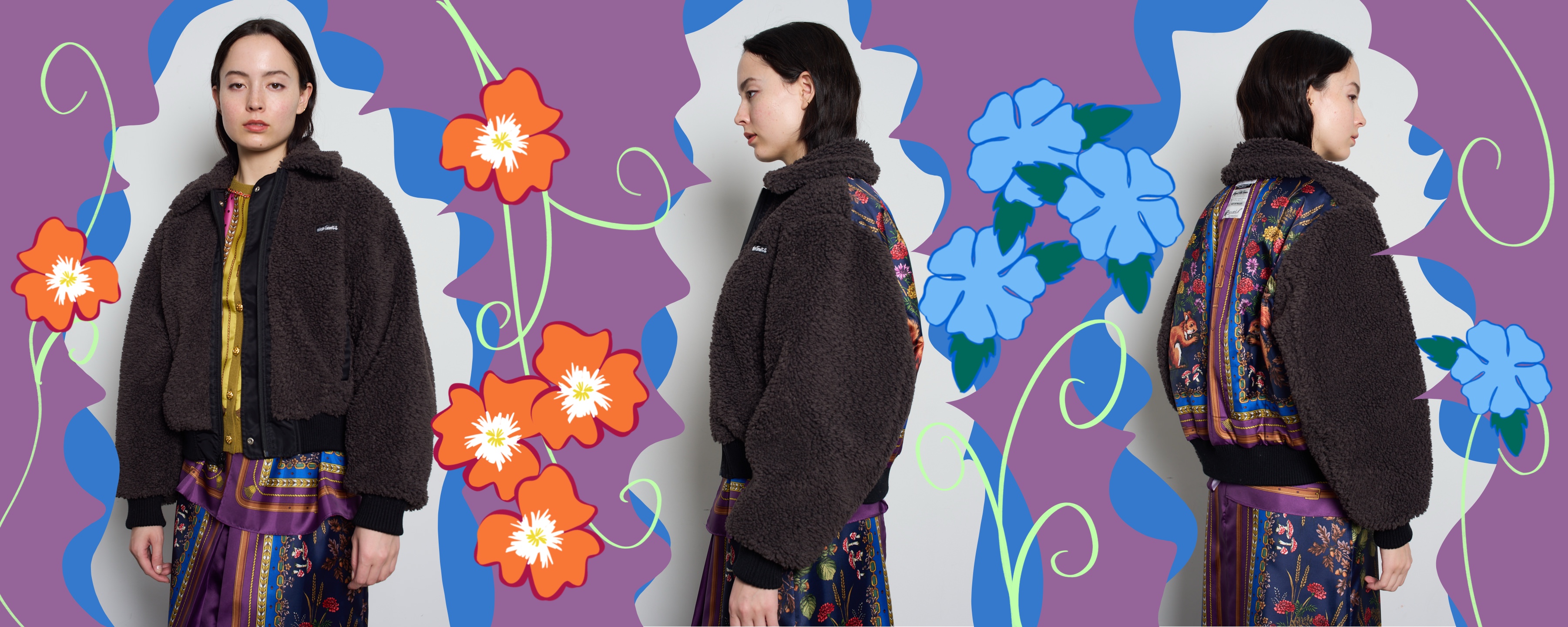カモフラージュのように見えるフラワープリントでオリジナルのボア素材をデザインしました。