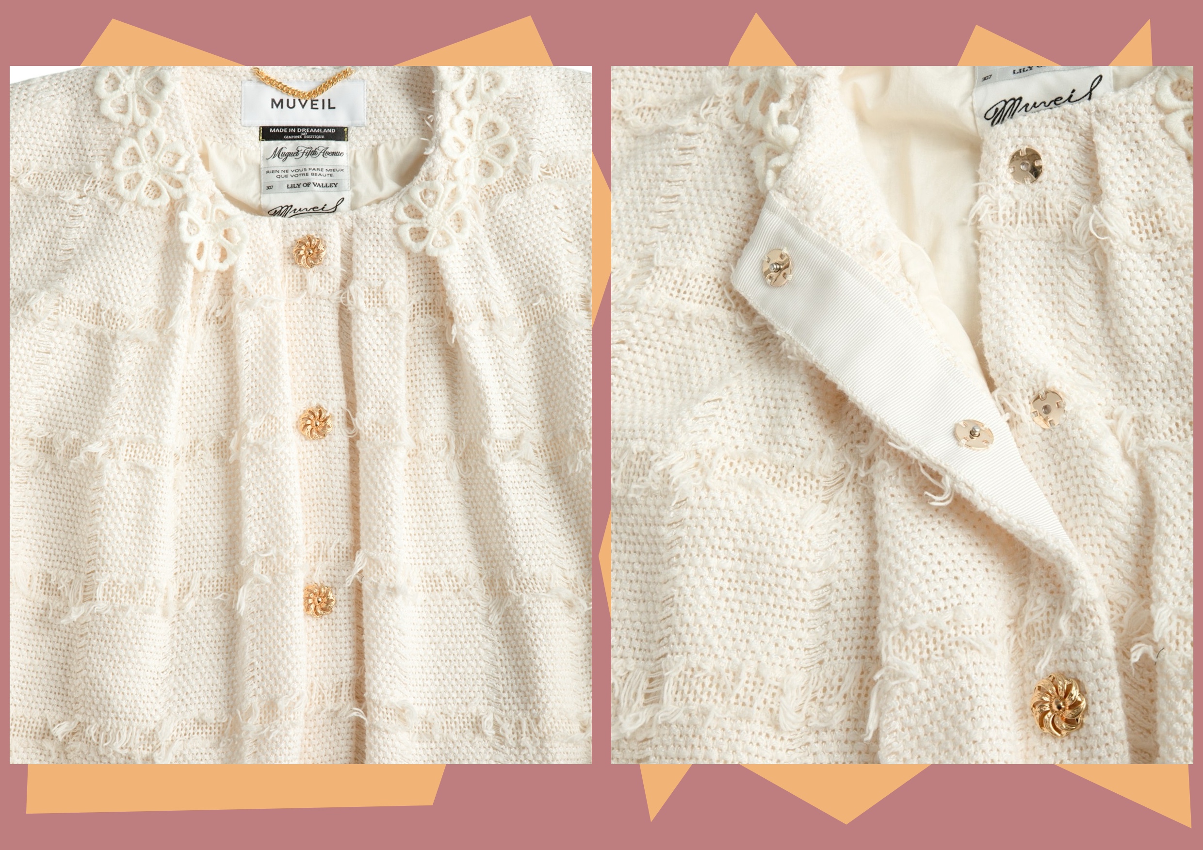 襟のフラワーモチーフやクラシカルなゴールドボタンでエレガントなアクセントを。