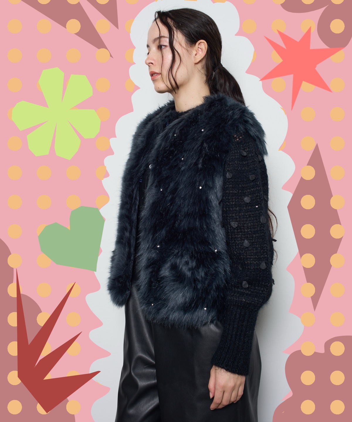 ストーンはもちろん、異なる色調のファーを組み合わせることで、ボリューム感のあるアウターでもメリハリのある印象です。