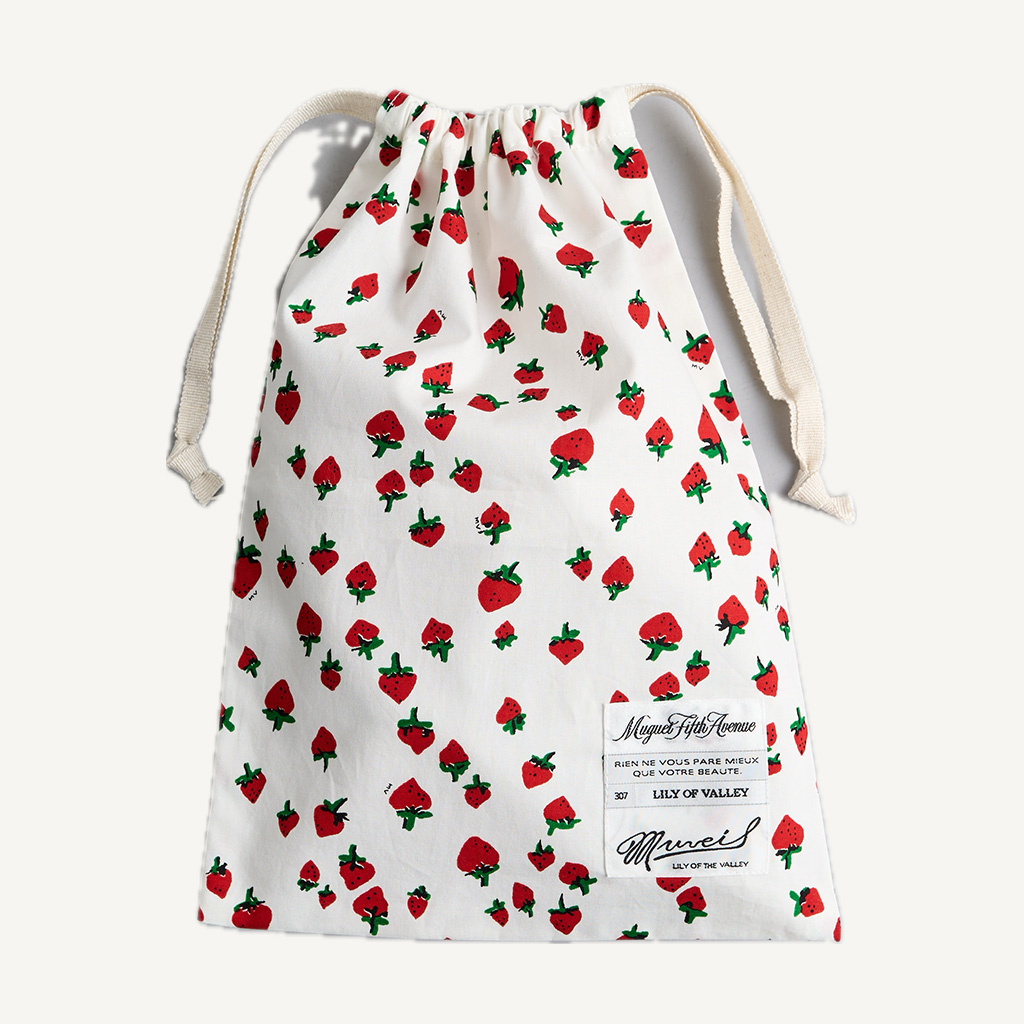 MUVEIL POP UP SHOP at 三越銀座店にて、期間中エムアイカードで税込33,000円以上お買いあげいただいた先着30名さまにMUVEIL POP UP限定オリジナルイチゴ柄巾着をプレゼント。
